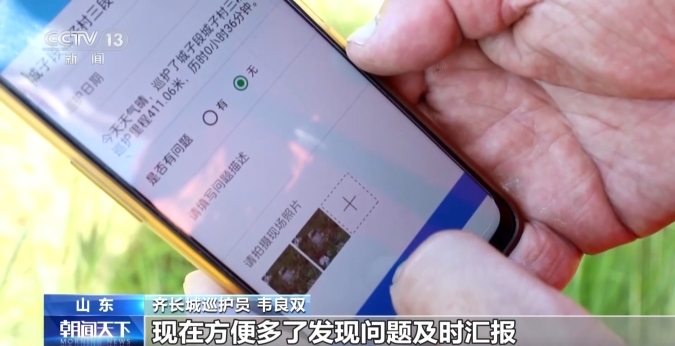 齊長城巡護員 韋良雙:如果沒有大風大雨和極端惡劣天氣,我們(men) 都是每天來巡護一趟,每趟大約需要3至4個(ge) 小時。如果發現自然災害或者人為(wei) 造成的損壞,我們(men) 會(hui) 立即拍照上傳(chuan) 。原來的時候得在本子上登記,現在方便多了,發現問題及時匯報。