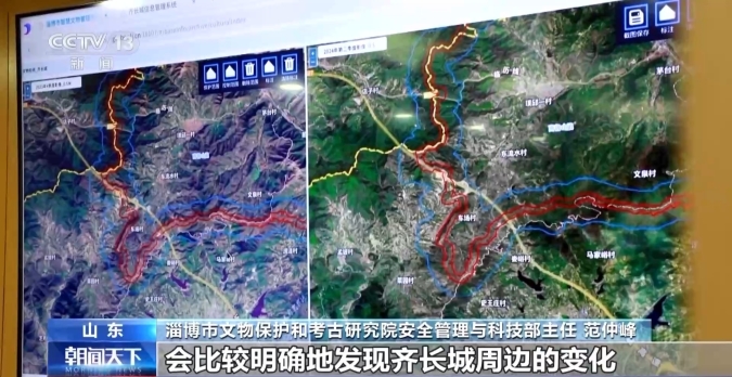 淄博市文物保護和考古研究院安全管理與(yu) 科技部主任 範仲峰:有些地段山比較高,巡護員到達率可能不是太理想,尤其是在雨雪天氣,是登不到山頂的。我們(men) 充分運用了衛星圖片對比功能,通過圖片的變化,會(hui) 比較明確地發現齊長城周邊的變化,提高了我們(men) 巡護的視野。下一步我們(men) 可能會(hui) 充分使用無人機,包括一些地理信息相關(guan) 的最新數據,補充和完善我們(men) 的巡護係統。