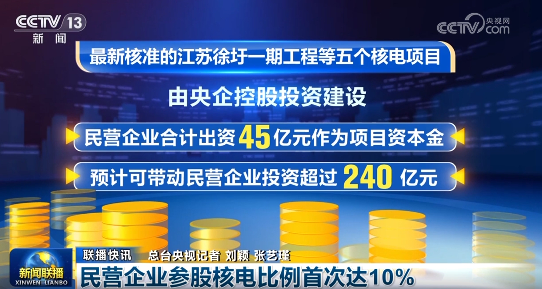 記者從(cong) 國家發展改革委了解到,近期國務院核準的江蘇徐圩一期工程等五個(ge) 核電項目,由央企控股投資建設,民營企業(ye) 合計出資45億(yi) 元作為(wei) 項目資本金,預計可帶動民營企業(ye) 投資超過240億(yi) 元。民營企業(ye) 參股核電的比例首次提高到了10%,核電領域進一步向民資放開。