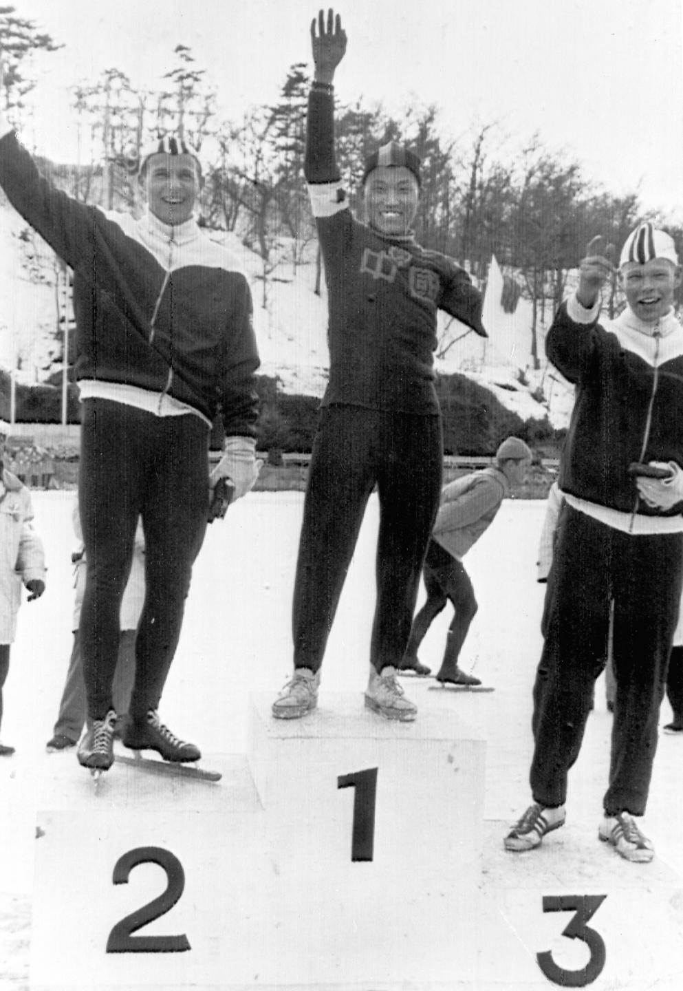 1963年2月24日,在日本舉(ju) 行的世界速度滑冰錦標賽中,羅致煥獲得男子1500米項目冠軍(jun) 。這是中國運動員第一次取得冰雪項目的單項世界冠軍(jun) 。圖為(wei) 羅致煥(中)受獎後向觀眾(zhong) 致意。 新華社發(資料照片)