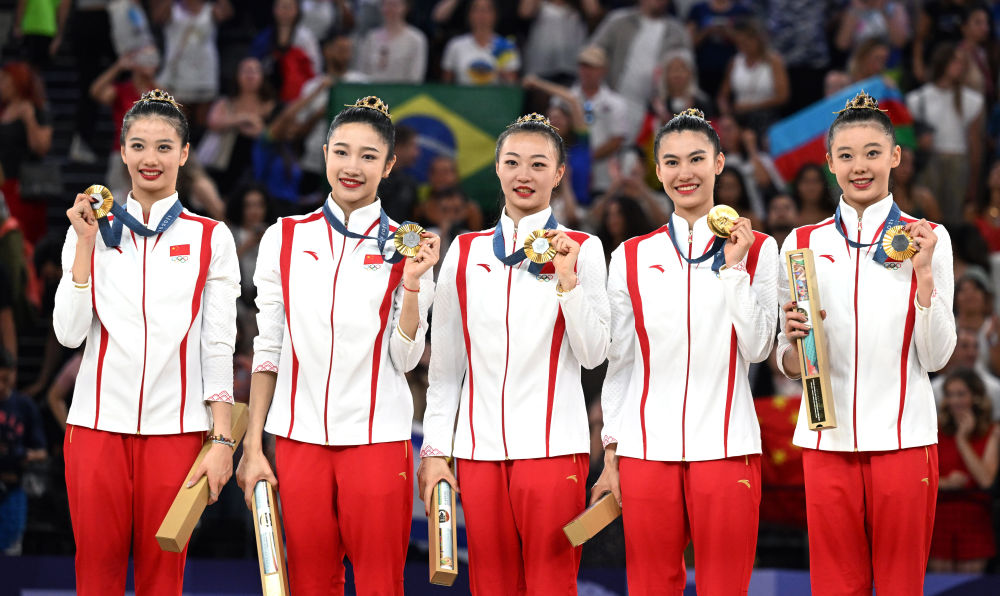 8月10日,中國隊在頒獎儀(yi) 式上。當日,在巴黎奧運會(hui) 藝術體(ti) 操項目集體(ti) 全能決(jue) 賽中,中國隊獲得冠軍(jun) 。新華社記者 程敏 攝