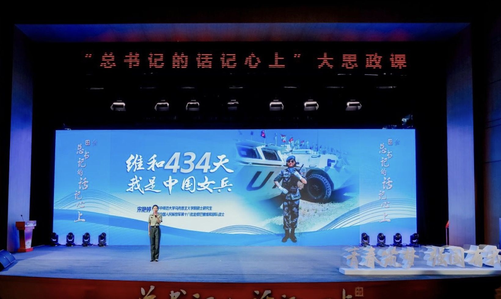 “大家好,我來自華中師範大學馬克思主義(yi) 學院的宋豔婷!”9月24日,身著一身戎裝的宋豔婷身姿筆挺,在“總書(shu) 記的話記心上”大思政課現場,向廣大學子講述她的維和故事。一個(ge) 幹脆利落的敬禮,引起現場的熱烈掌聲。她曾作為(wei) 第十八批赴黎巴嫩維和建築工兵分隊隊員,在黎巴嫩執行維和任務。