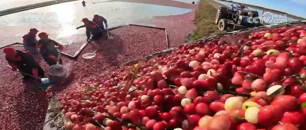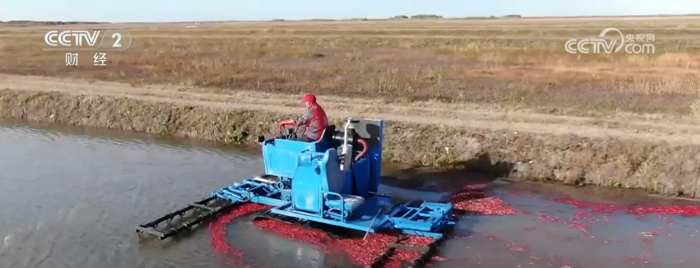 成熟的蔓越莓怎麽(me) 收獲呢?轉過來看這裏,這就是記者所說蔓越莓的地塊為(wei) 什麽(me) 像池塘,因為(wei) 這裏灌進水,工作人員就駕駛著采收機就可以收獲了,采收機上有兩(liang) 排鋼條,它能將水裏的蔓越莓從(cong) 植株上脫落下來。因為(wei) 蔓越莓裏麵是空心的,所以能夠浮在水麵上。我們(men) 看,采收機走過之後,後麵的蔓越莓就漂上來了。工作人員隻需要來回多次的行駛,就可以把成熟的果子都收獲下來,這種方式收獲率可以達到97%以上。每個(ge) 地塊都這麽(me) 大,飄在水上的蔓越莓怎麽(me) 才能收回來呢?工作人員在水裏用木板把這些蔓越莓聚攏到一起,再通過提升機就可以裝到車廂裏了。每到蔓越莓收獲的季節,田裏就變成了紅色的海洋,非常漂亮。
