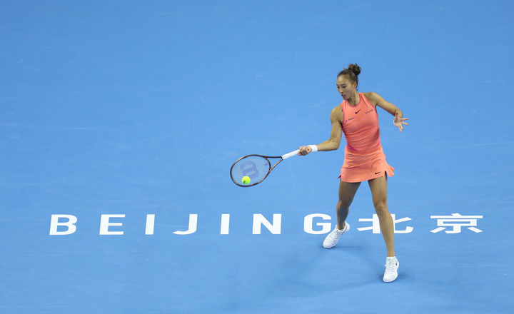 10月2日,鄭欽文在比賽中回球。當日,在北京進行的2024中國網球公開賽女子單打第四輪比賽中,中國選手鄭欽文2比1戰勝美國選手阿尼西莫娃,晉級八強。新華社發(杜昕怡攝)