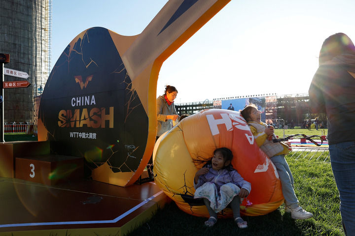 10月1日,孩子們(men) 在大滿貫公園玩耍。當日,2024年世界乒乓球職業(ye) 大聯盟(WTT)中國大滿貫比賽繼續在北京進行。新華社記者 王麗(li) 莉 攝