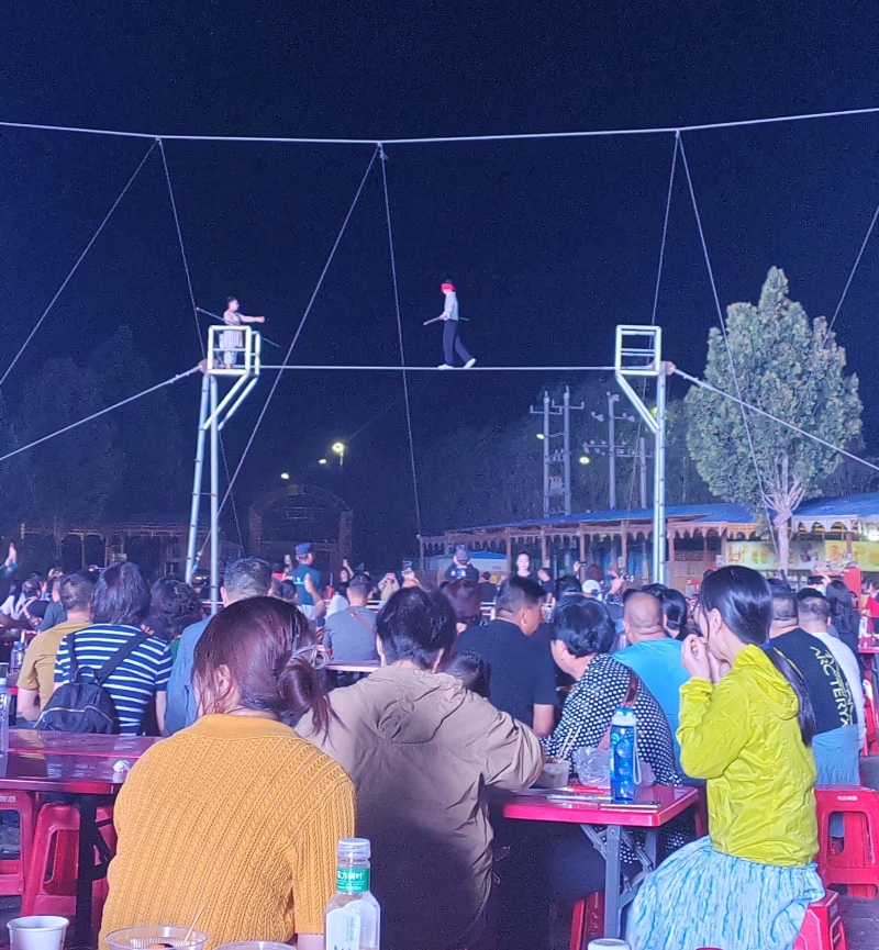 夜幕降臨(lin) ,華燈初上,阿克蘇老街夜市美食與(yu) 文化的融合相得益彰。特色烤包子、烤全羊、抓飯、肚包肉等美食的香氣與(yu) 攤主的叫賣聲交織在一起;民族樂(le) 器、木盤、木碗、木勺等非遺產(chan) 品,既有滄桑感,更有文化味;達瓦孜表演中,兩(liang) 名演員在手持平衡杆,在高空繩索上表演前後走動、盤腿端坐、蒙眼行走、飛身跳躍等一係列驚心動魄的技藝,引得觀眾(zhong) 拍手稱絕;賽乃姆、龜茲(zi) 樂(le) 舞等讓人們(men) 感受到了中華文化的魅力和深厚底蘊。