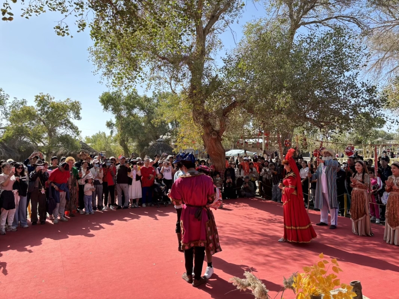 國慶期間,遊客在觀看尉犁縣羅布人村寨景區民俗表演。 羅布人村寨景區供圖
