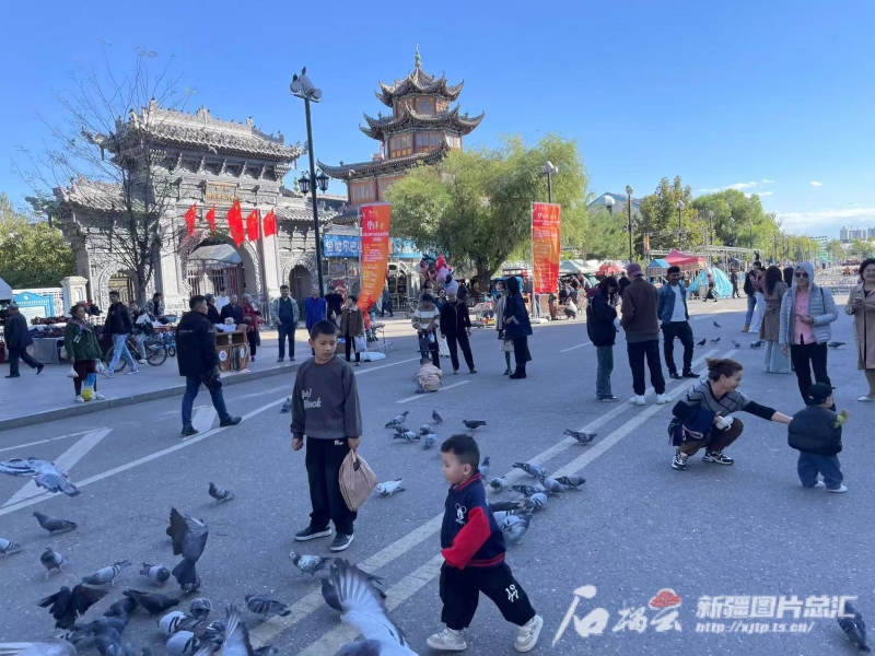 伊寧市喀讚其民俗旅遊區遊人與(yu) 鴿子嬉戲。石榴雲(yun) /新疆日報記者姚剛攝