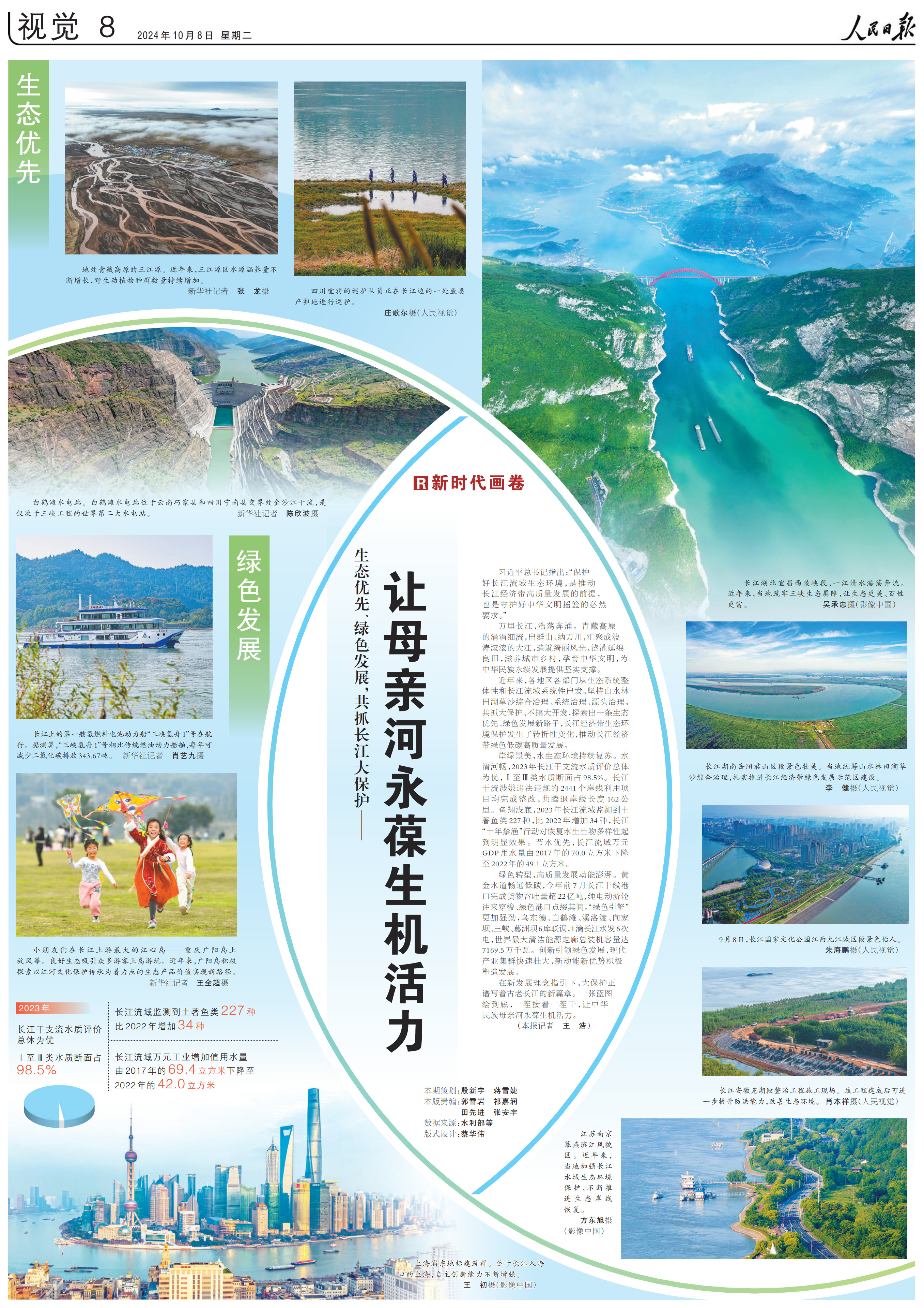 岸綠景美,水生態環境持續複蘇。水清河暢,2023年長江幹支流水質評價(jia) 總體(ti) 為(wei) 優(you) ,Ⅰ至Ⅲ類水質斷麵占98.5%。長江幹流涉嫌違法違規的2441個(ge) 岸線利用項目均完成整改,共騰退岸線長度162公裏。魚翔淺底,2023年長江流域監測到土著魚類227種,比2022年增加34種,長江“十年禁漁”行動對恢複水生生物多樣性起到明顯效果。節水優(you) 先,長江流域萬(wan) 元GDP用水量由2017年的70.0立方米下降至2022年的49.1立方米。