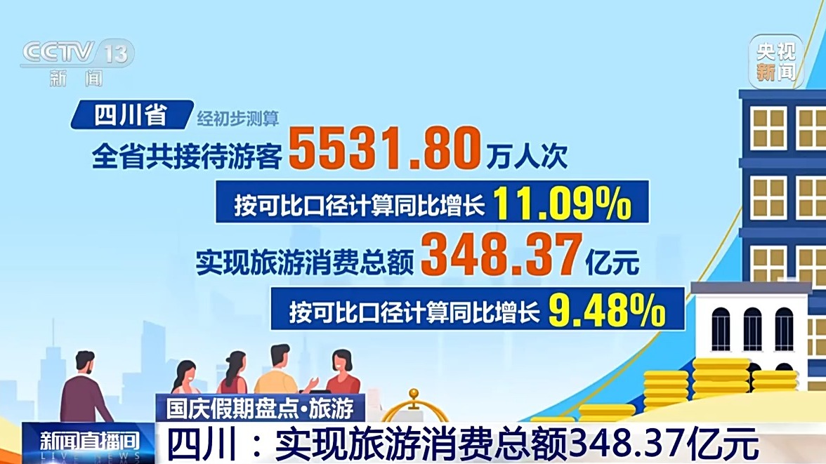 四川省經初步測算,全省共接待遊客5531.80萬(wan) 人次,實現旅遊消費總額348.37億(yi) 元,按可比口徑計算,同比分別增長11.09%和9.48%。全省核心旅遊景區“狀態拉滿”,17家5A級景區累計接待遊客426.93萬(wan) 人次、實現門票收入1.85億(yi) 元,同比分別增長25.06%和15.48%,超越假日曆史最高水平。九寨溝景區連續4天均達4.1萬(wan) 人承載量上限。