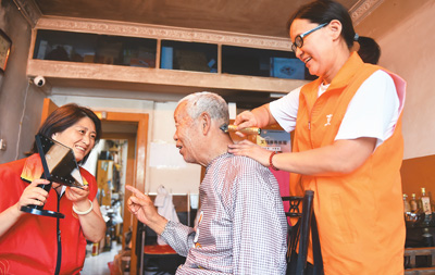 河南省洛陽市澗西區積極構建“嵌入式”養(yang) 老服務體(ti) 係,為(wei) 老年人提供養(yang) 老助餐、社區娛樂(le) 、健康管理、上門保潔等綜合養(yang) 老服務項目,讓老人在家門口享受全方位養(yang) 老。圖為(wei) 澗西區武漢路街道秦嶺路社區,養(yang) 老服務中心護理員和社區誌願者為(wei) 居家老人理發。黃政偉(wei) 攝(人民視覺)