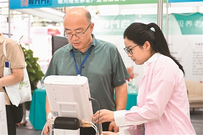 2024寧夏養(yang) 老服務業(ye) 博覽會(hui) 近日在寧夏銀川市舉(ju) 辦。本屆博覽會(hui) 集中展示國內(nei) 外養(yang) 老服務前沿科技和最新成果,推動健康養(yang) 老產(chan) 業(ye) 向更深層次、更寬領域、更全方位發展。圖為(wei) 會(hui) 上工作人員向參觀者介紹醫療產(chan) 品。新華社記者 毛 竹攝