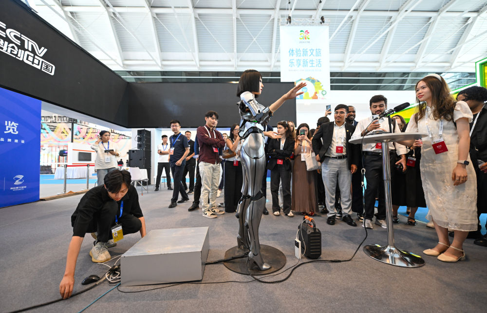 會(hui) 展搭建師在天津舉(ju) 辦的中國文化旅遊產(chan) 業(ye) 博覽會(hui) 現場維護AI機器人互動設備(9月13日攝)。新華社記者 孫凡越 攝