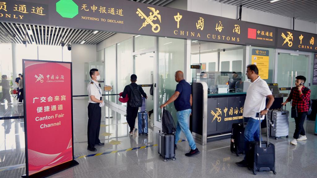 入境展客商經廣州會(hui) 展中心海關(guan) 在琶洲港澳客運口岸設置的廣交會(hui) 來賓便捷通道通關(guan) 。(韓建全攝)