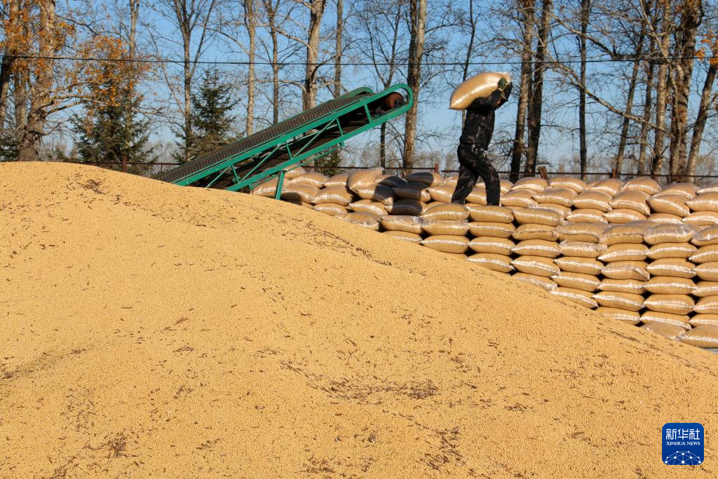 10月3日,在北大荒集團黑龍江五大連池農(nong) 場有限公司第一作業(ye) 區糧食晾曬場,種植戶在堆放大豆。新華社發(陸文祥攝)
