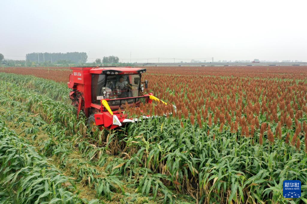 10月7日,在河北省邢台市南和區和陽鎮東(dong) 關(guan) 村,農(nong) 民駕駛收割機收獲高粱(無人機照片)。新華社記者 王曉 攝