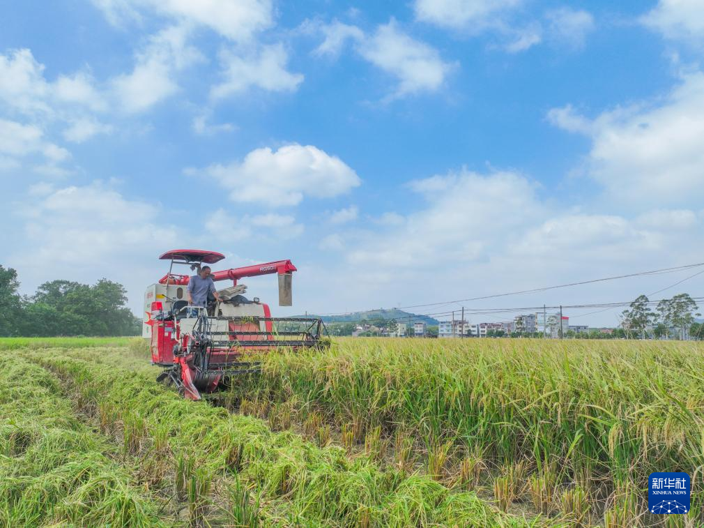 10月9日,在湖南省永州市道縣四馬橋鎮燕山腳村,農(nong) 機手駕駛機械收割晚稻(無人機照片)。新華社發(蔣克青攝)