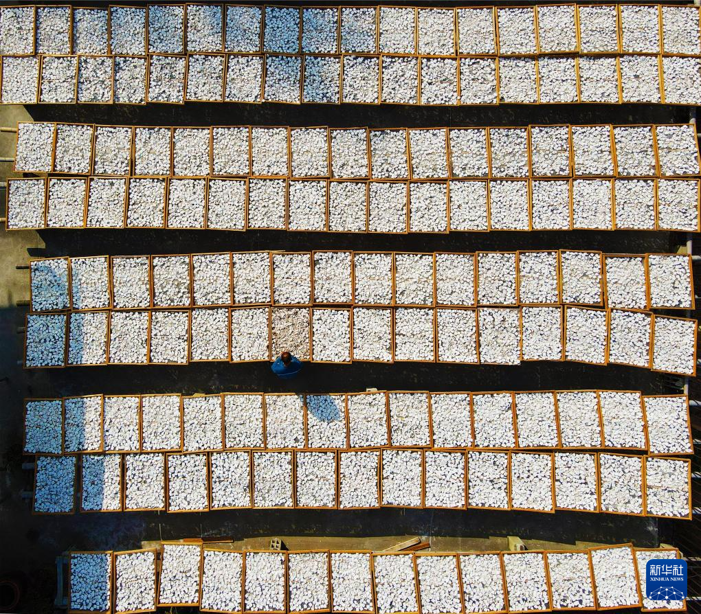 10月4日,在安徽省安慶市嶽西縣響腸鎮千佛塔村,村民在曬茯苓(無人機照片)。新華社發(吳均奇攝)