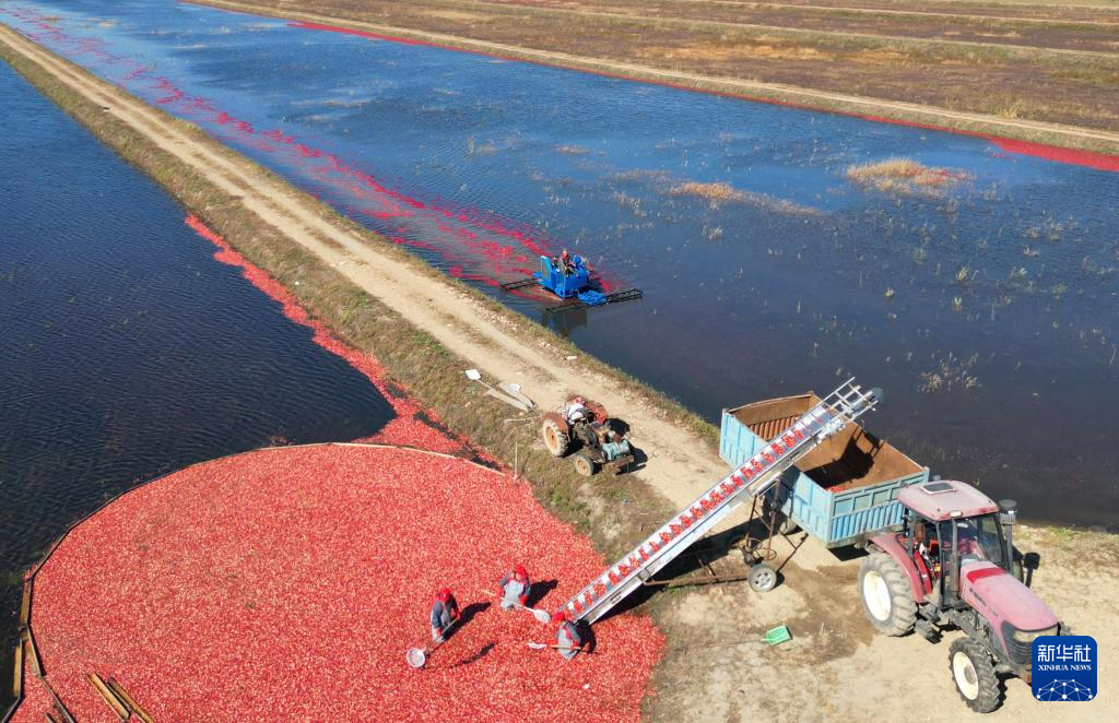10月4日,在黑龍江省撫遠市蔓越莓種植基地,工人在水中采收蔓越莓(無人機照片)。新華社發(李擁軍(jun) 攝)