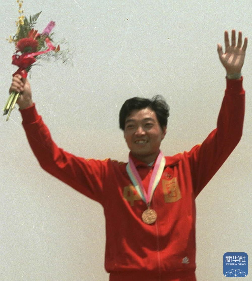 1984年洛杉磯奧運會(hui) 上,許海峰在獲得男子自選手槍項目冠軍(jun) 後領獎(資料照片)。 新華社發