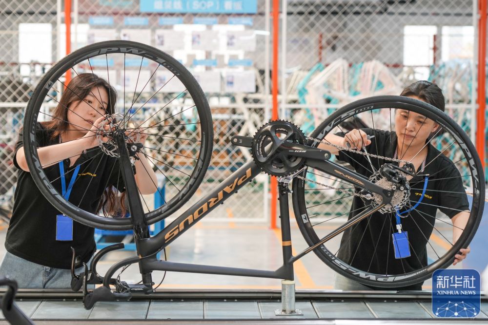 2024年7月8日,在山東(dong) 泰山瑞豹複合材料有限公司生產(chan) 車間,工人在組裝碳纖維自行車。位於(yu) 山東(dong) 樂(le) 陵經濟開發區的泰山體(ti) 育產(chan) 業(ye) 集團為(wei) 2024巴黎奧運會(hui) 的摔跤、自行車、跆拳道、體(ti) 操、田徑等比賽提供器材。新華社記者 朱崢攝