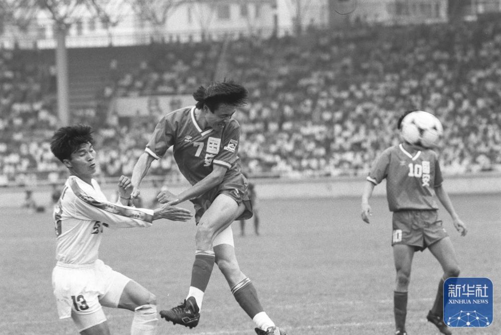 1994是中國足球職業(ye) 化改革元年。這是1994年4月17日,全國足球甲級聯賽全麵拉開戰幕。廣東(dong) 宏遠俱樂(le) 部隊主場0比2負於(yu) 北京國安俱樂(le) 部隊,這是國安隊7號謝峰(中)在頭球攻門。 新華社記者 劉彥武攝