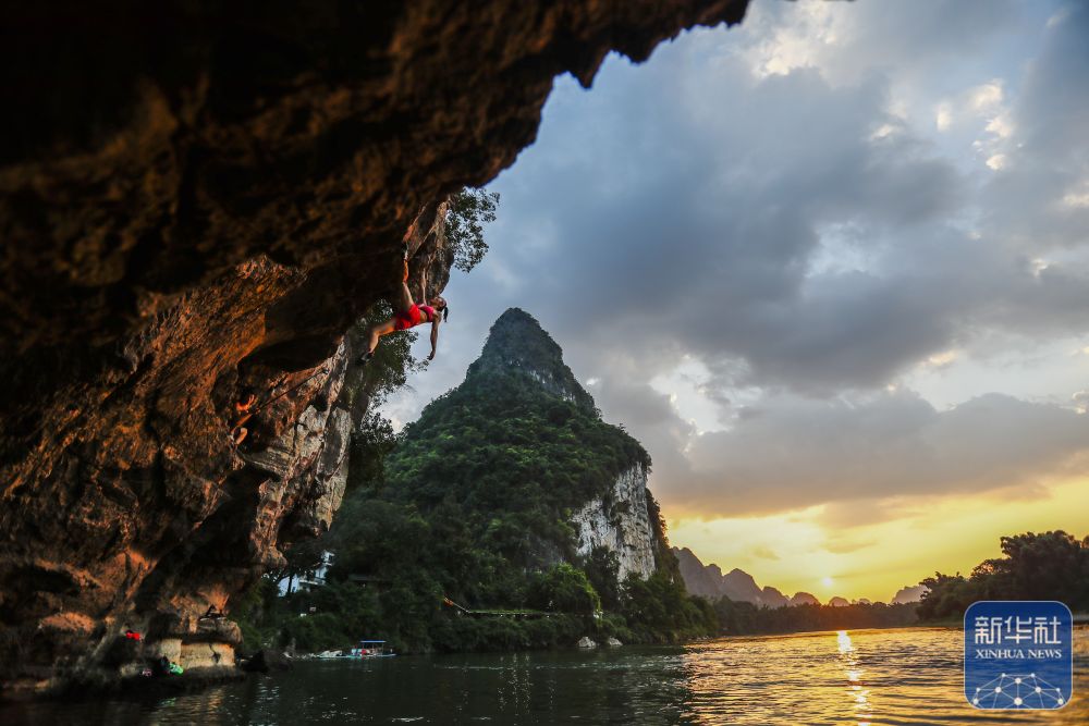 2023年9月5日,攀岩愛好者在廣西桂林市陽朔縣進行深水抱石。新華社記者 胡星宇 攝