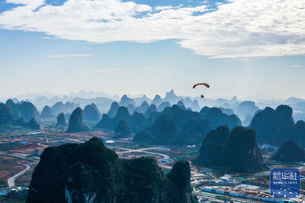 遊客在廣西桂林市陽朔縣體(ti) 驗動力滑翔傘(san) (2019年11月14日攝,無人機照片)。 新華社記者 曹禕銘 攝