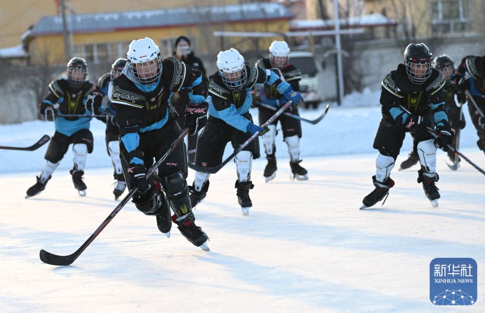 烏(wu) 魯木齊縣水西溝中學冰球隊在訓練(2023年12月20日攝)。 新華社記者 李賀 攝