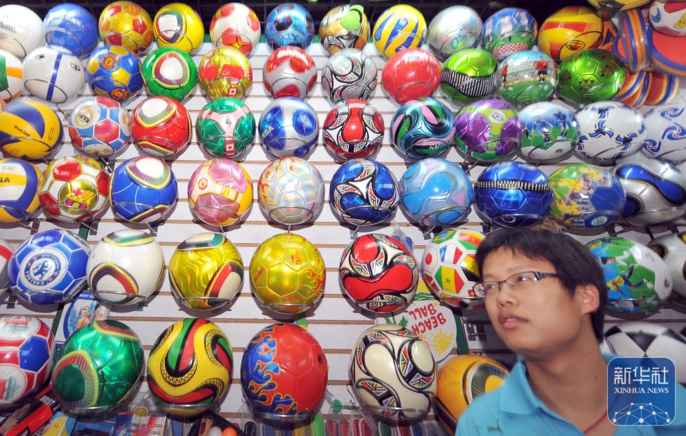 2010年6月23日,一位顧客正在浙江義(yi) 烏(wu) 小商品市場內(nei) 選購足球。據義(yi) 烏(wu) 海關(guan) 統計,受南非世界杯帶動,當地體(ti) 育用品的月度出口額連續半年超過1000萬(wan) 美元,2010年前5個(ge) 月的出口額比前一年同期增長110%。 新華社記者 王定昶 攝