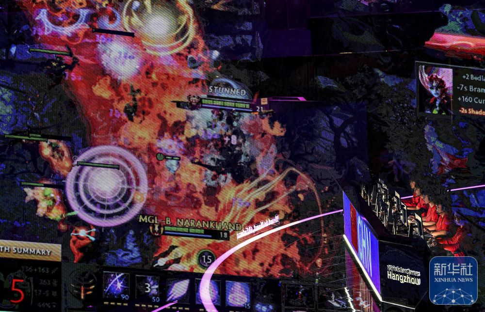 2023年10月2日,中國隊選手在比賽中(多重曝光照片)。 當日,在杭州亞(ya) 運會(hui) 電子競技項目刀塔決(jue) 賽中,中國隊以2比1戰勝蒙古國隊,獲得冠軍(jun) 。 新華社記者 顏麟蘊 攝