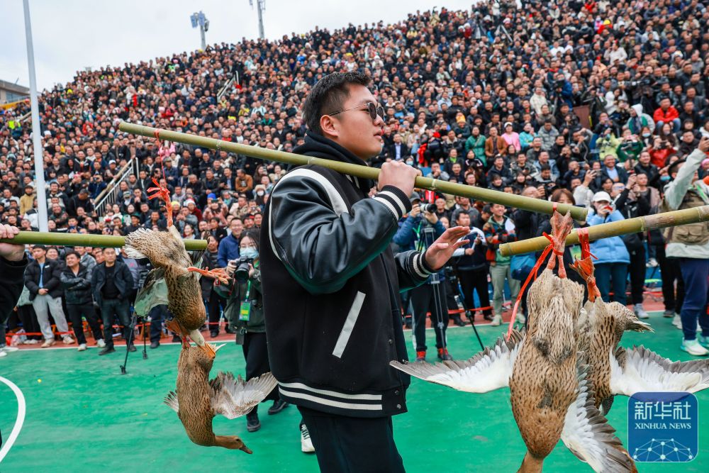 2023年3月27日,村民挑著當地農(nong) 特產(chan) 品“三穗麻鴨”進入賽場。這是季軍(jun) 銅仁市代表隊的獎品。 當日,貴州省首屆“美麗(li) 鄉(xiang) 村”籃球聯賽總決(jue) 賽在黔東(dong) 南州台江縣台盤村舉(ju) 行。新華社記者 歐東(dong) 衢 攝