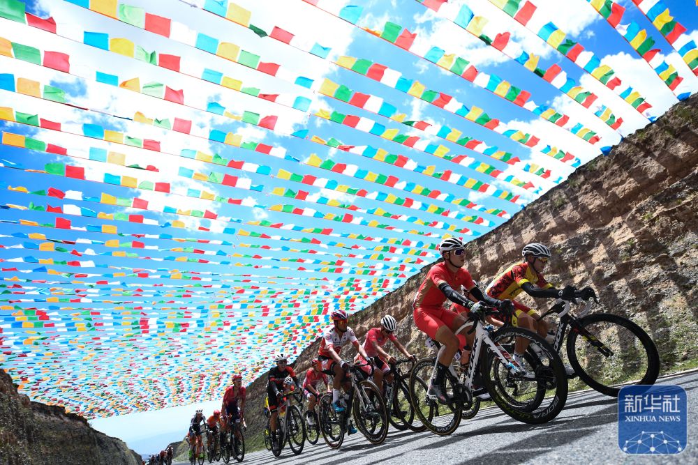 2022年7月29日,參賽選手在比賽中騎行。 當日,第二十一屆環青海湖國際公路自行車賽進行了第三賽段貴德至共和的角逐。 新華社記者 張龍 攝