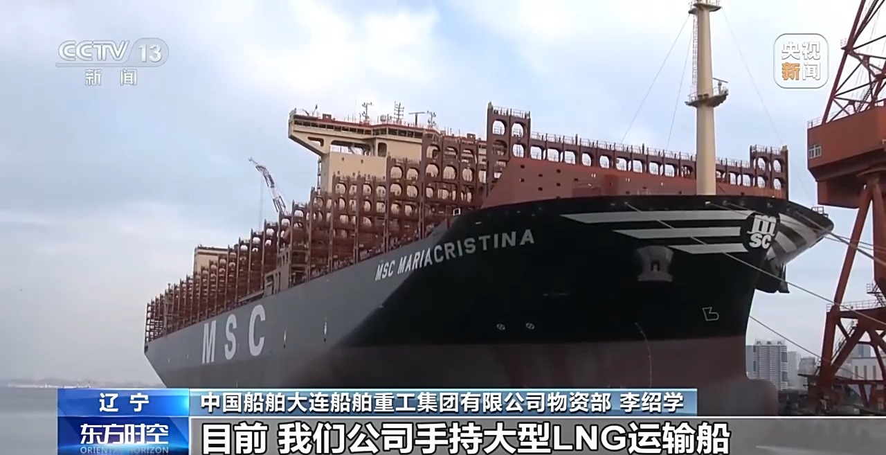 這兩(liang) 天,大連這家船舶公司一艘在建大型液化天然氣(LNG)運輸船停靠在碼頭泊位,近千名工人正在進行船舶舾裝作業(ye) 。在碼頭的另一側(ce) ,一艘LNG雙燃料集裝箱船正在做交付前最後的調試。這艘海上“巨無霸”采用天然氣和燃油雙燃料驅動,能夠減少碳排放20%以上,減少100%的硫氧化物排放。
