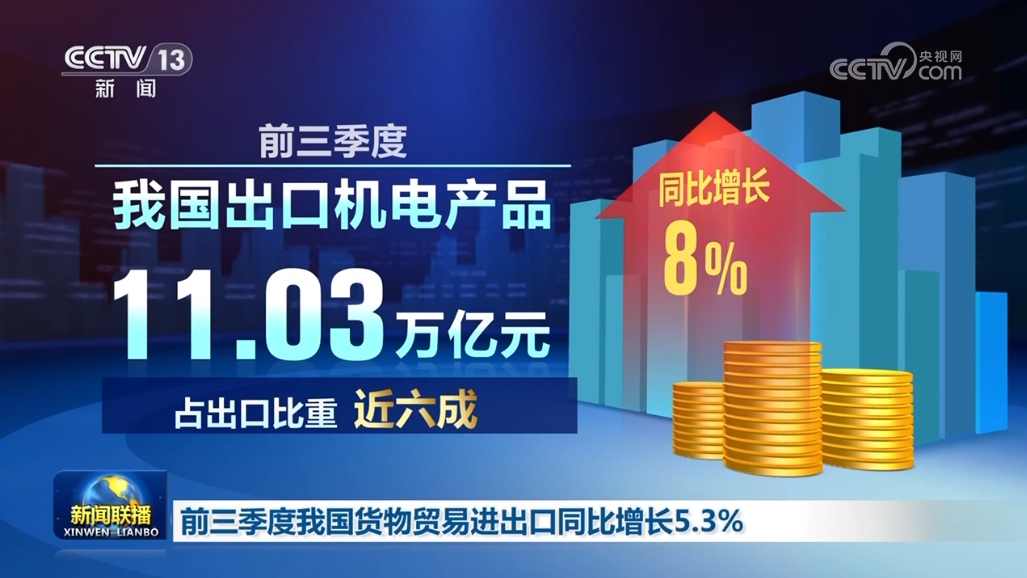 從(cong) 國內(nei) 看,出口產(chan) 品結構持續優(you) 化。前三季度,我國出口機電產(chan) 品11.03萬(wan) 億(yi) 元,同比增長8%,占出口比重近六成。