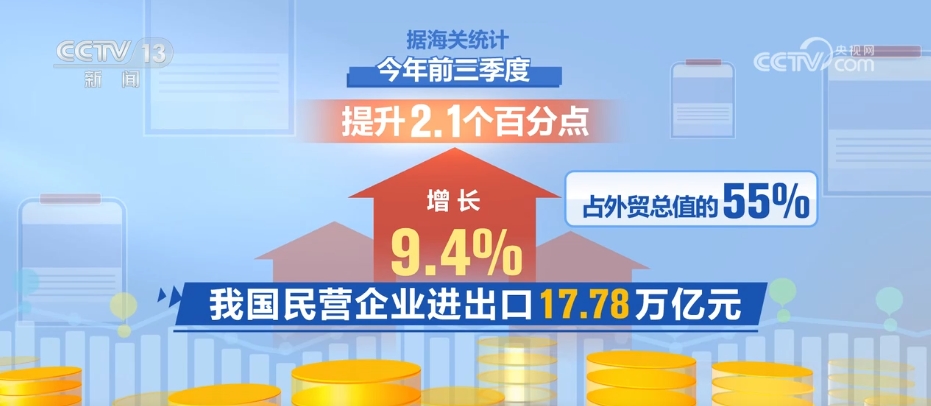據海關(guan) 統計,今年前三季度,我國民營企業(ye) 進出口17.78萬(wan) 億(yi) 元,增長9.4%,占外貿總值的55%,提升2.1個(ge) 百分點;外商投資企業(ye) 進出口9.53萬(wan) 億(yi) 元,增長1.1%,連續兩(liang) 個(ge) 季度增長;國有企業(ye) 進出口4.95萬(wan) 億(yi) 元,增長0.1%。