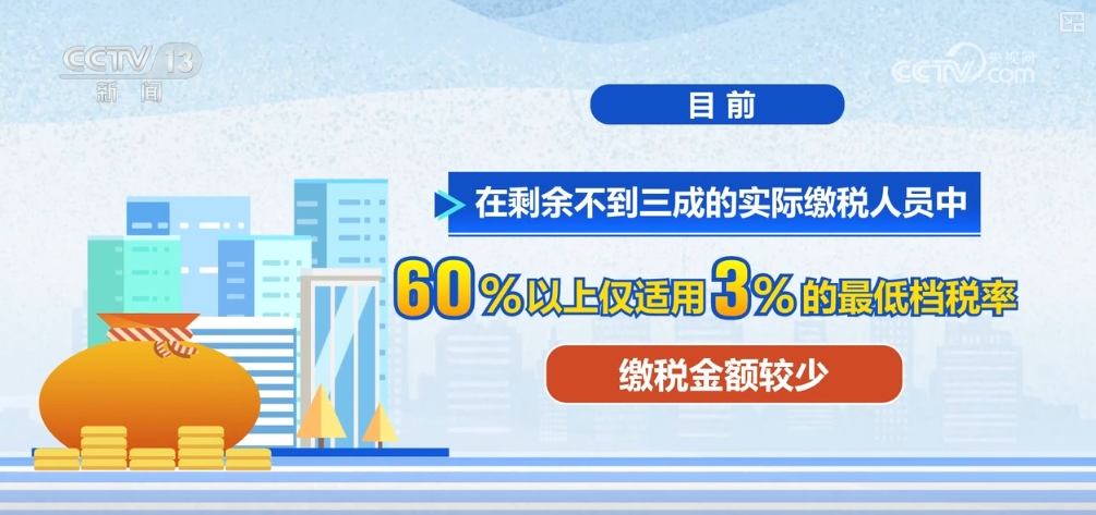國家稅務總局稅收數據顯示,目前,我國取得綜合所得的人員中,無需繳納個(ge) 稅的人員占比超過七成,在剩餘(yu) 不到三成的實際繳稅人員中,60%以上僅(jin) 適用3%的最低檔稅率,繳稅金額較少。