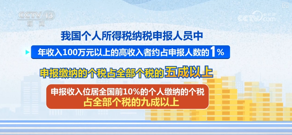 數據顯示,我國個(ge) 人所得稅納稅申報人員中,年收入100萬(wan) 元以上的高收入者約占申報人數的1%,但這部分人申報繳納的個(ge) 稅占全部個(ge) 稅的五成以上,申報收入位居全國前10%的個(ge) 人繳納的個(ge) 稅占全部個(ge) 稅的九成以上。