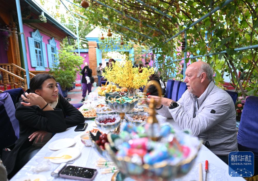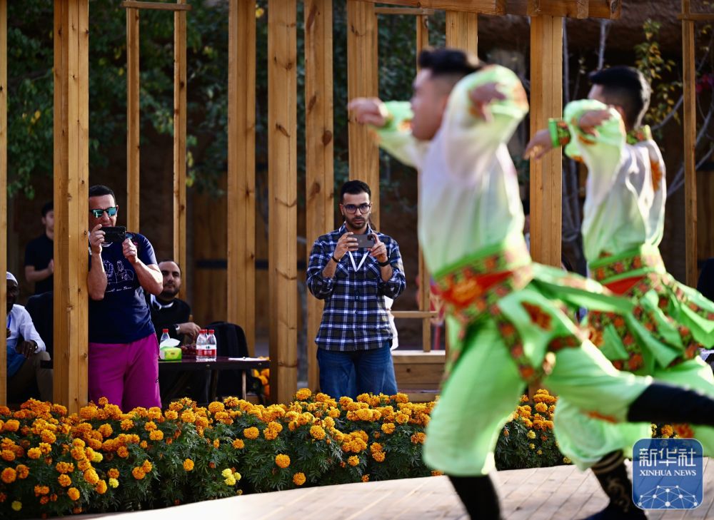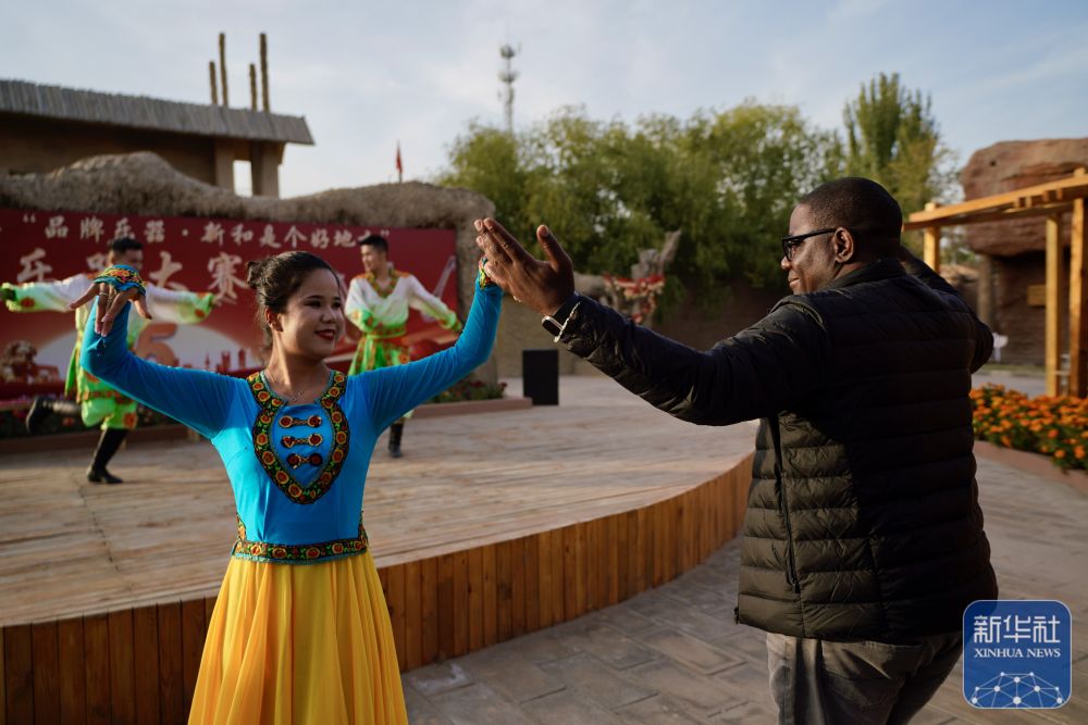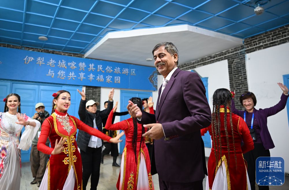 10月15日,與(yu) 會(hui) 嘉賓在伊寧市喀讚其民俗旅遊區與(yu) 表演者互動。