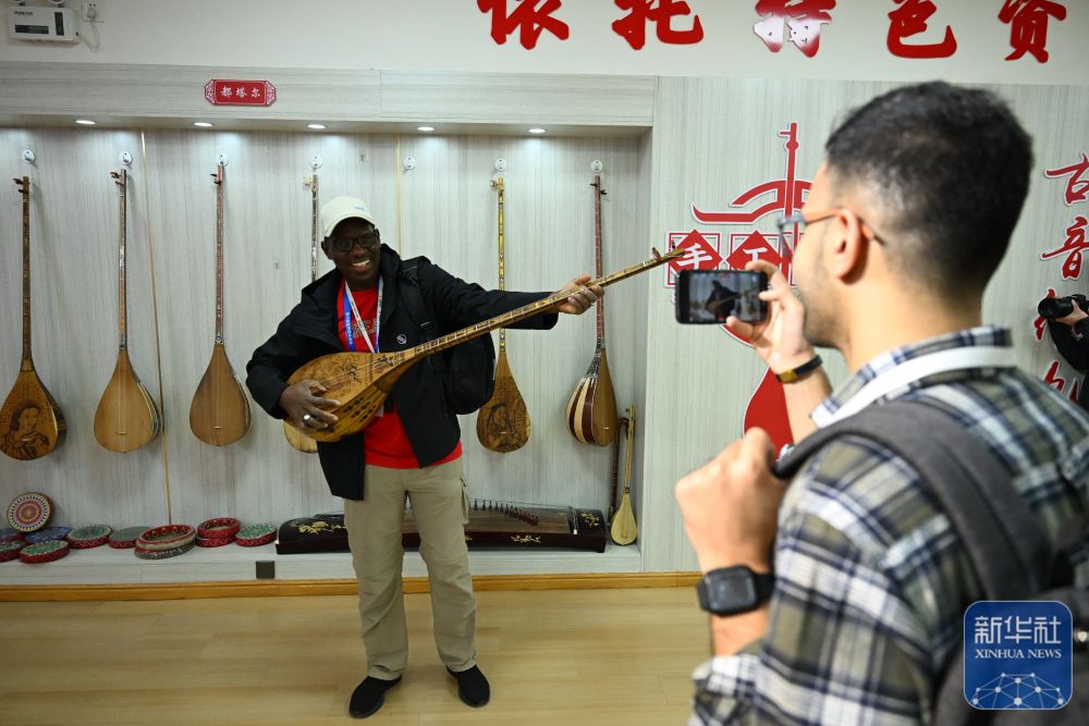 10月15日,與(yu) 會(hui) 嘉賓在阿克蘇地區新和縣加依村加依手工樂(le) 器產(chan) 業(ye) 園體(ti) 驗傳(chuan) 統樂(le) 器。