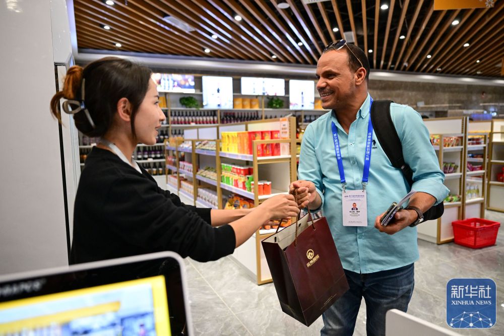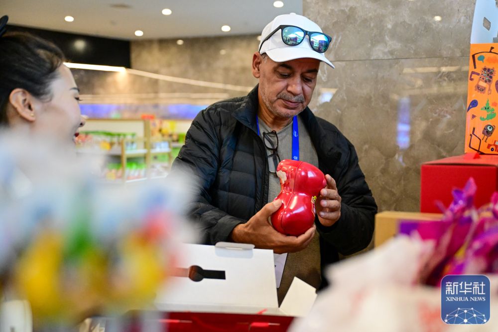 10月15日,與(yu) 會(hui) 嘉賓在新疆喀什跨境電商進出口商品展示交易中心購買(mai) 紀念品。