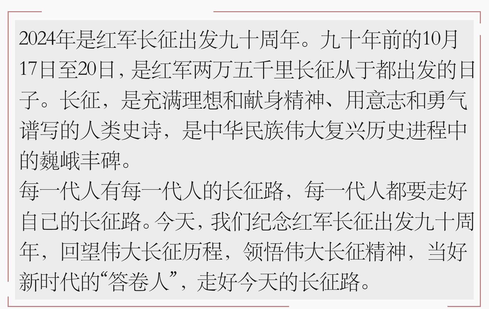 長征是一次理想信念的偉(wei) 大遠征。中國共產(chan) 黨(dang) 領導紅軍(jun) ,以非凡的智慧和大無畏的英雄氣概,戰勝千難萬(wan) 險,付出巨大犧牲,勝利完成震撼世界、彪炳史冊(ce) 的長征,實現了中國共產(chan) 黨(dang) 和中國革命事業(ye) 從(cong) 挫折走向勝利的偉(wei) 大轉折,開啟了中國共產(chan) 黨(dang) 為(wei) 實現民族獨立、人民解放而鬥爭(zheng) 的新的偉(wei) 大進軍(jun) 。