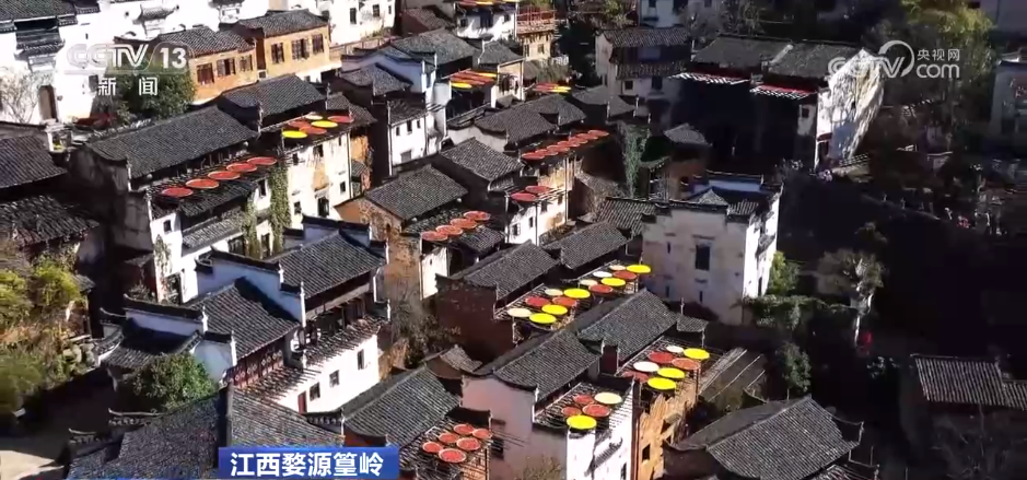 在江西婺源篁嶺,多種農(nong) 產(chan) 品和徽派建築對比鮮明,共同構成了婺源獨特的“曬秋”景觀。優(you) 質的生態環境孕育了“紅、綠、黑、白、黃”五大特色物產(chan) ,“曬秋”成為(wei) “中國最美鄉(xiang) 村”的特有名片。