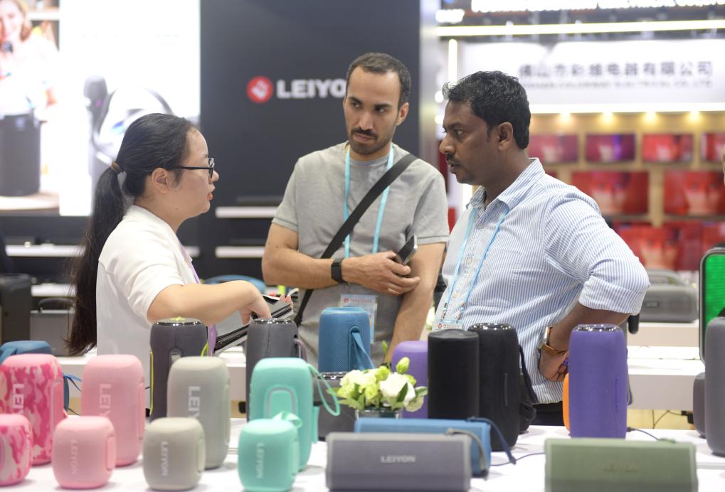10月15日,客商在廣交會(hui) 展館內(nei) 參觀選購音箱。新華社記者盧漢欣 攝