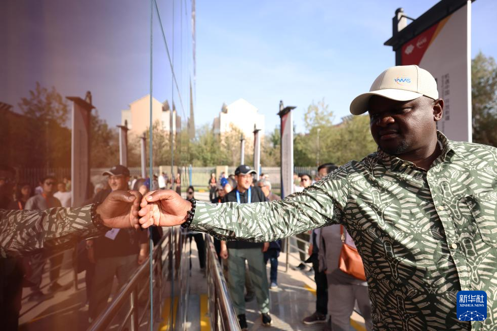 10月15日,嘉賓觸摸吐魯番光伏電站中控大樓外牆光伏板。新華社記者 李明 攝