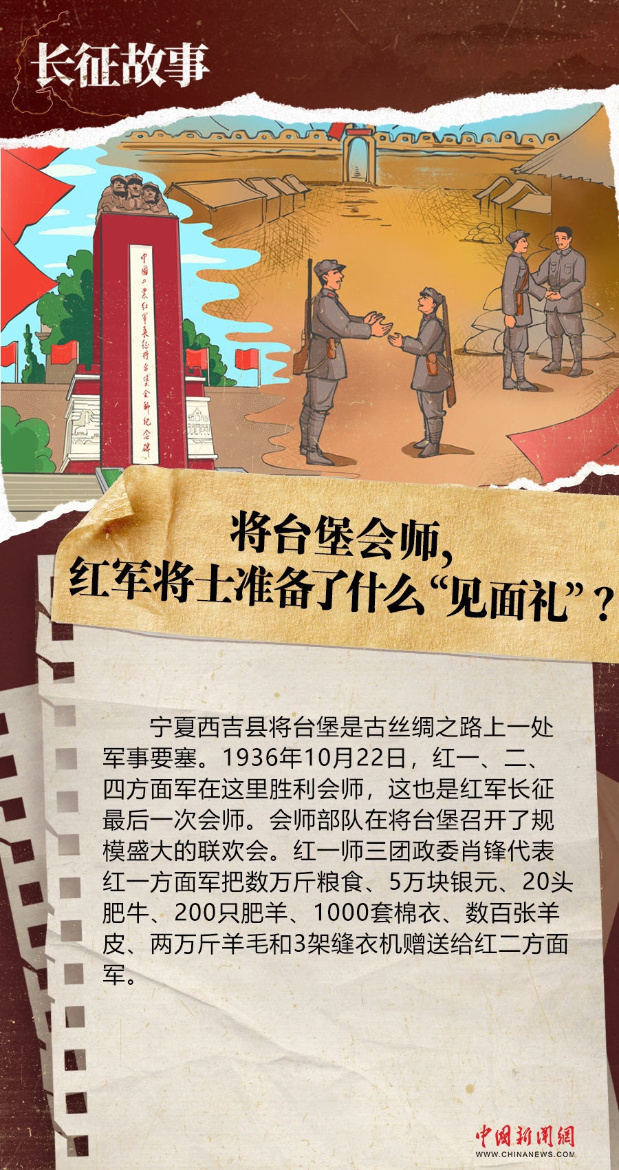 寧夏西吉縣將台堡是古絲(si) 綢之路上一處軍(jun) 事要塞。1936年10月22日,紅一、二、四方麵軍(jun) 在這裏勝利會(hui) 師,這也是紅軍(jun) 長征最後一次會(hui) 師。會(hui) 師部隊在將台堡召開了規模盛大的聯歡會(hui) 。紅一師三團政委肖鋒代表紅一方麵軍(jun) 把數萬(wan) 斤糧食、5萬(wan) 塊銀元、20頭肥牛、200隻肥羊、1000套棉衣、數百張羊皮、兩(liang) 萬(wan) 斤羊毛和3架縫衣機贈送給紅二方麵軍(jun) 。