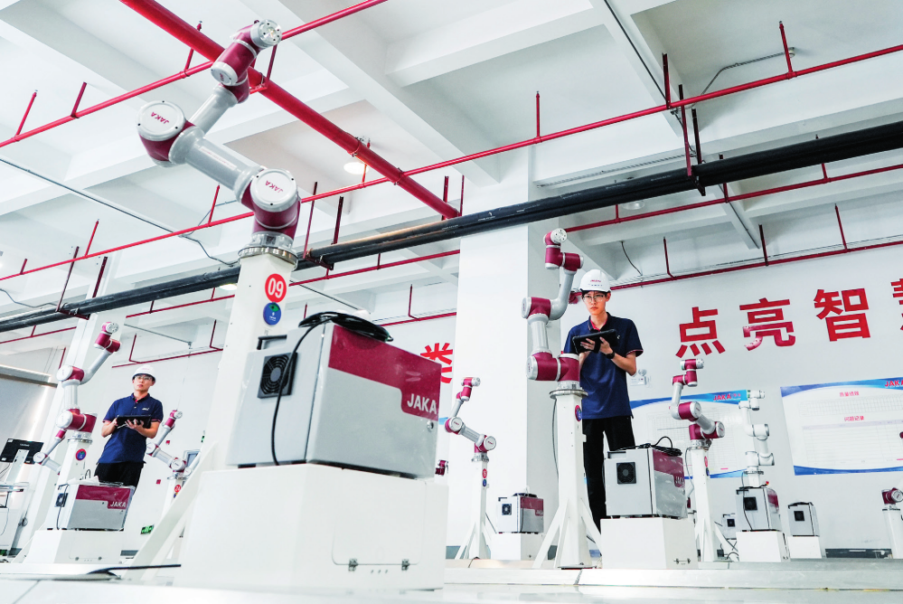 在位於(yu) 江蘇省常州市武進區的常州節卡智能裝備有限公司製造基地,工作人員在對柔性智能協作機器人進行全係列測試(2024 年 6 月 14 日攝) 李博攝 / 本刊