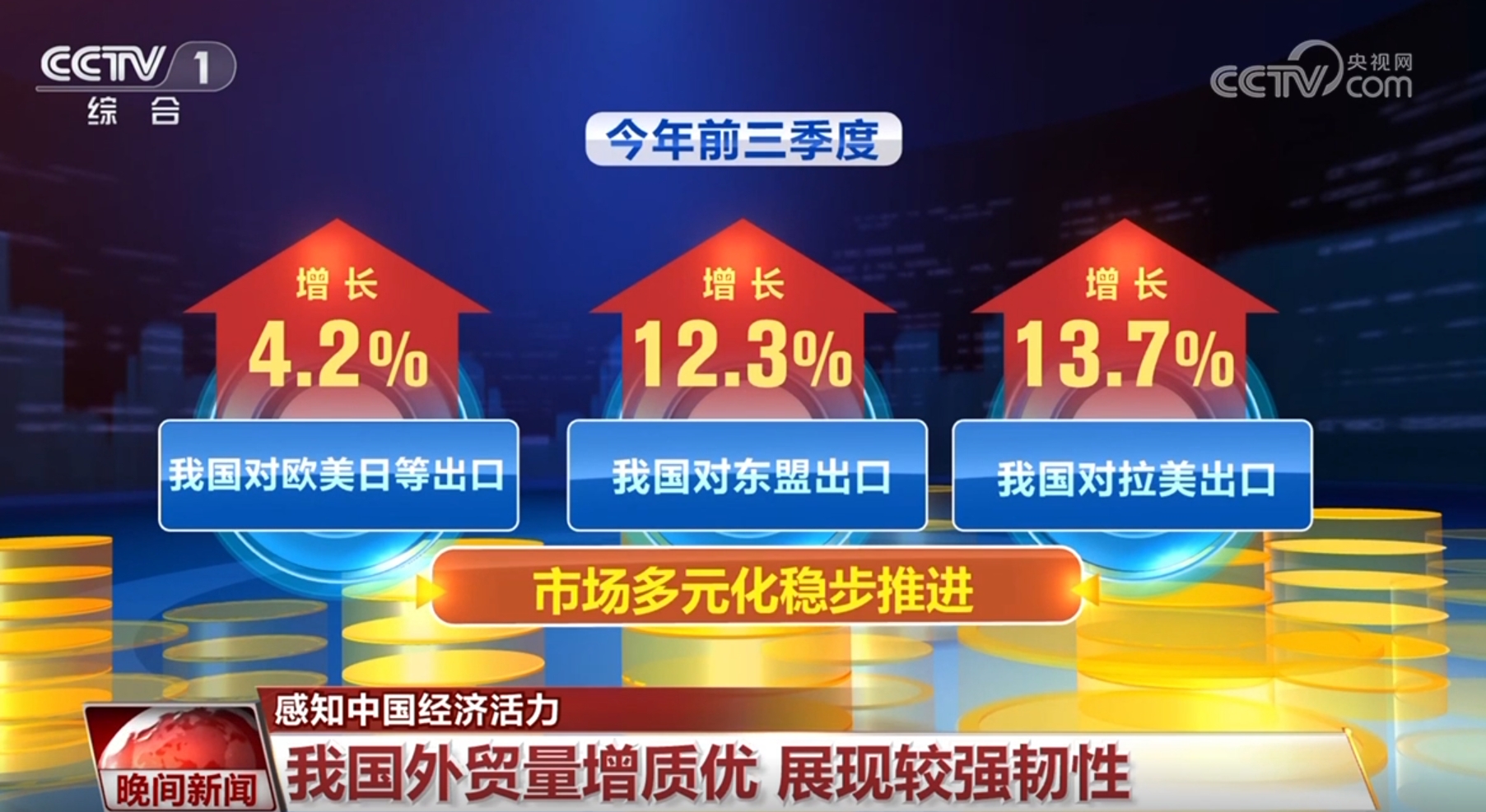 今年以來,我國外貿量增質優(you) ,展現較強韌性。世貿組織最新數據顯示:上半年我國出口國際市場份額為(wei) 14.3%,同比提高0.4個(ge) 百分點。前三季度,我國與(yu) 160多個(ge) 國家和地區貿易實現增長,對歐美日等傳(chuan) 統市場出口增長了4.2%,對東(dong) 盟、拉美等新興(xing) 市場出口分別增長了12.3%和13.7%,市場多元化穩步推進。在深圳鹽田港,僅(jin) 今年前9個(ge) 月就新增了16條航線。
