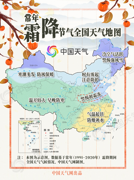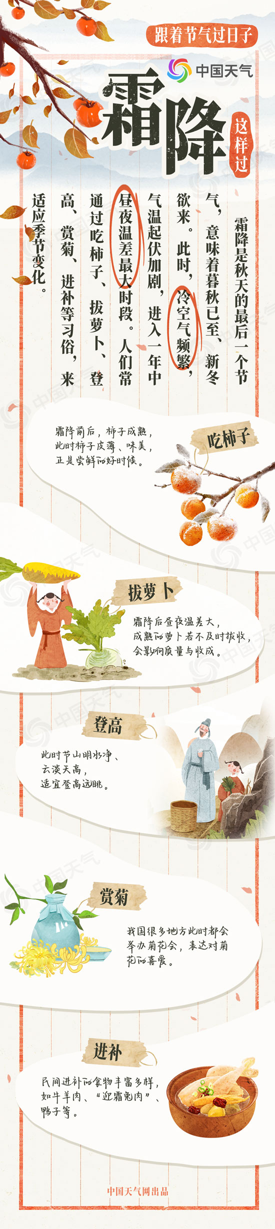 春生夏長,秋收冬藏,跟著節氣過日子。今天(10月23日)進入秋天的最後一個(ge) 節氣——霜降,意味著暮秋已至、新冬欲來。此時,冷空氣頻繁,氣溫起伏加劇,進入一年中晝夜溫差最大時段。人們(men) 常通過吃柿子、拔蘿卜、登高、賞菊、進補等習(xi) 俗,來適應季節變化。中國天氣網特別推出霜降風俗圖鑒和霜降全國天氣地圖,看看這個(ge) 節氣怎麽(me) 過。