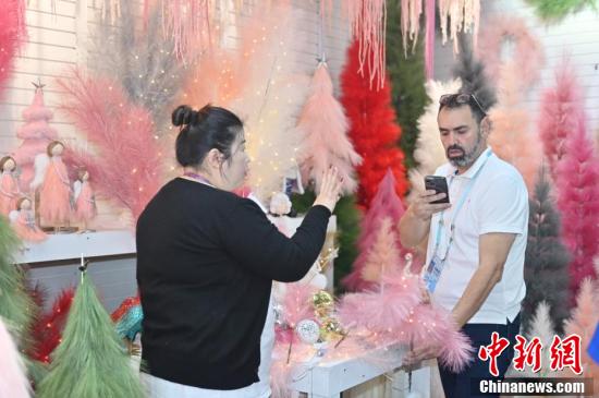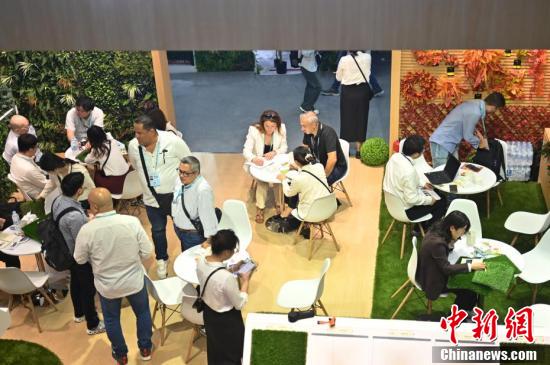 第136屆廣交會(hui) 第二期的園林用品展區吸引采購商(左)谘詢洽談。